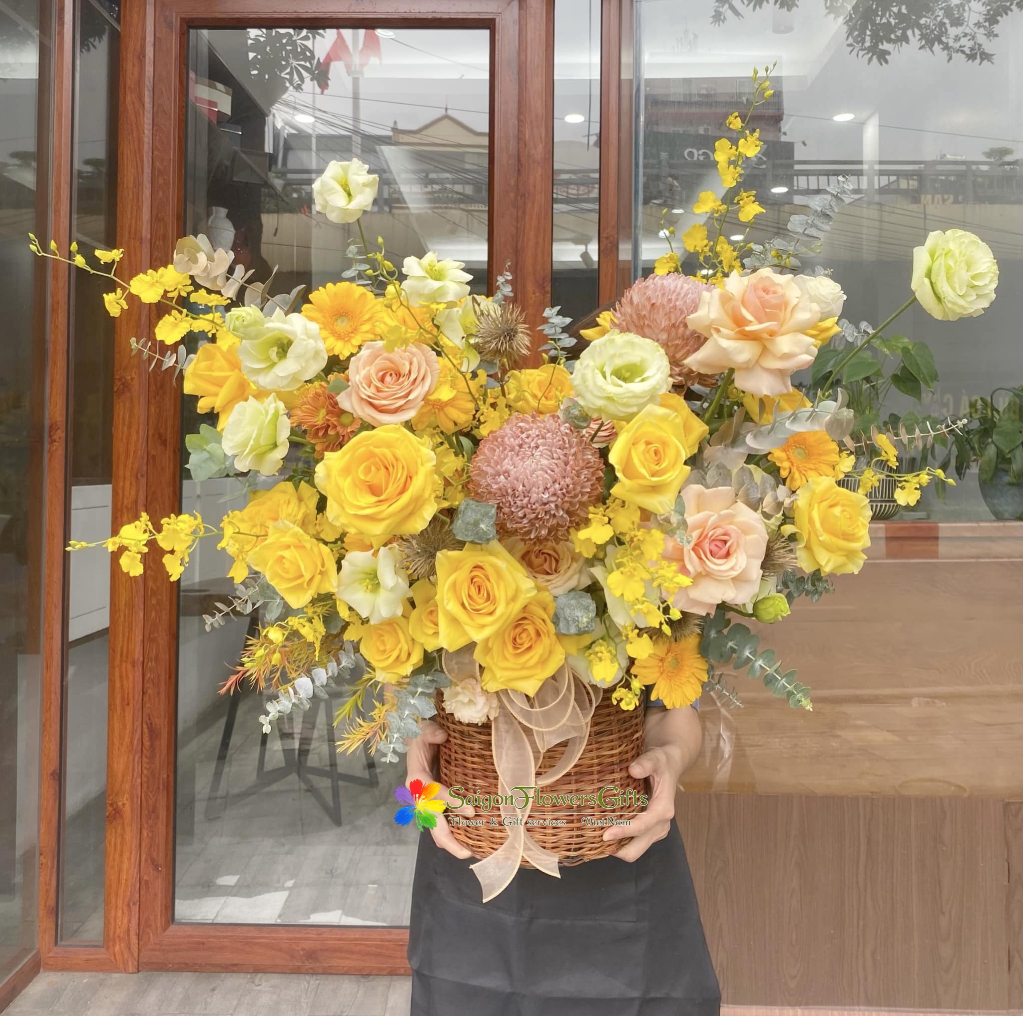 Saigon yellow basket birthday arrangement